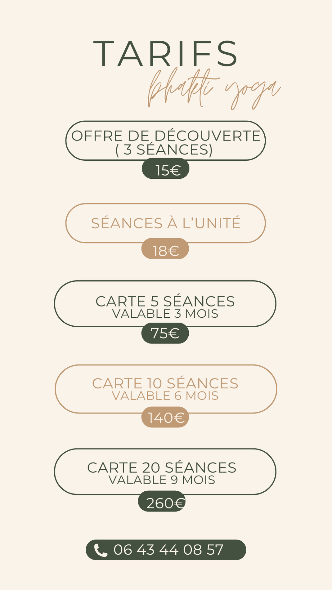 Offre découverte carte 3 séances d'essai avant engagement, carte 5 séances, carte 10 séances, carte 20 séances avec règlement en deux fois possible.