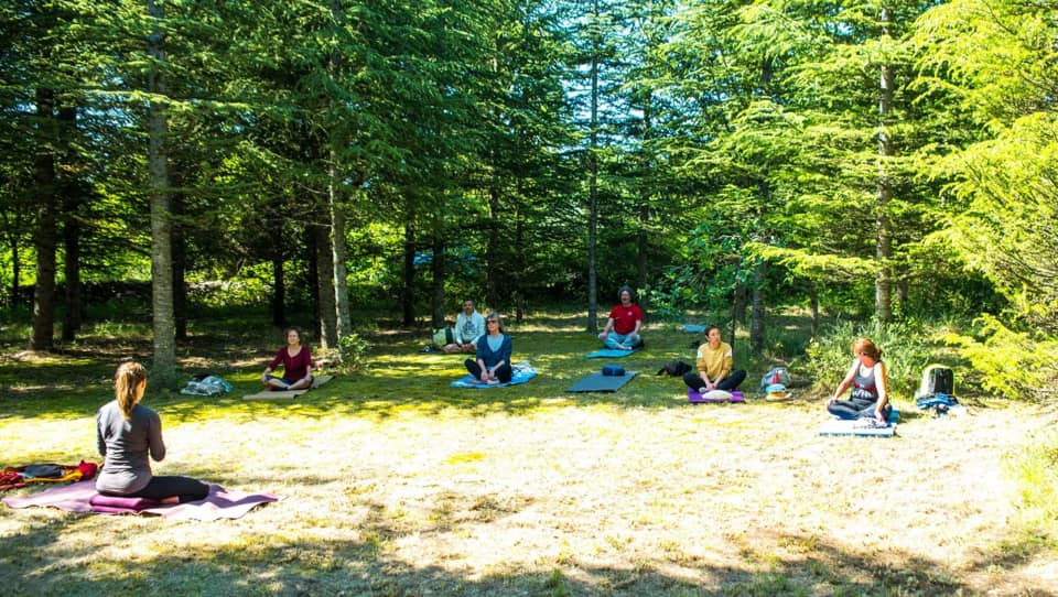cours collectif à l'ombre de grands arbres du lundi au vendredi de 9h30 à 12h. Yoga pour tous niveaux, selon l'enseignement de Boris Tatzky (Hatha